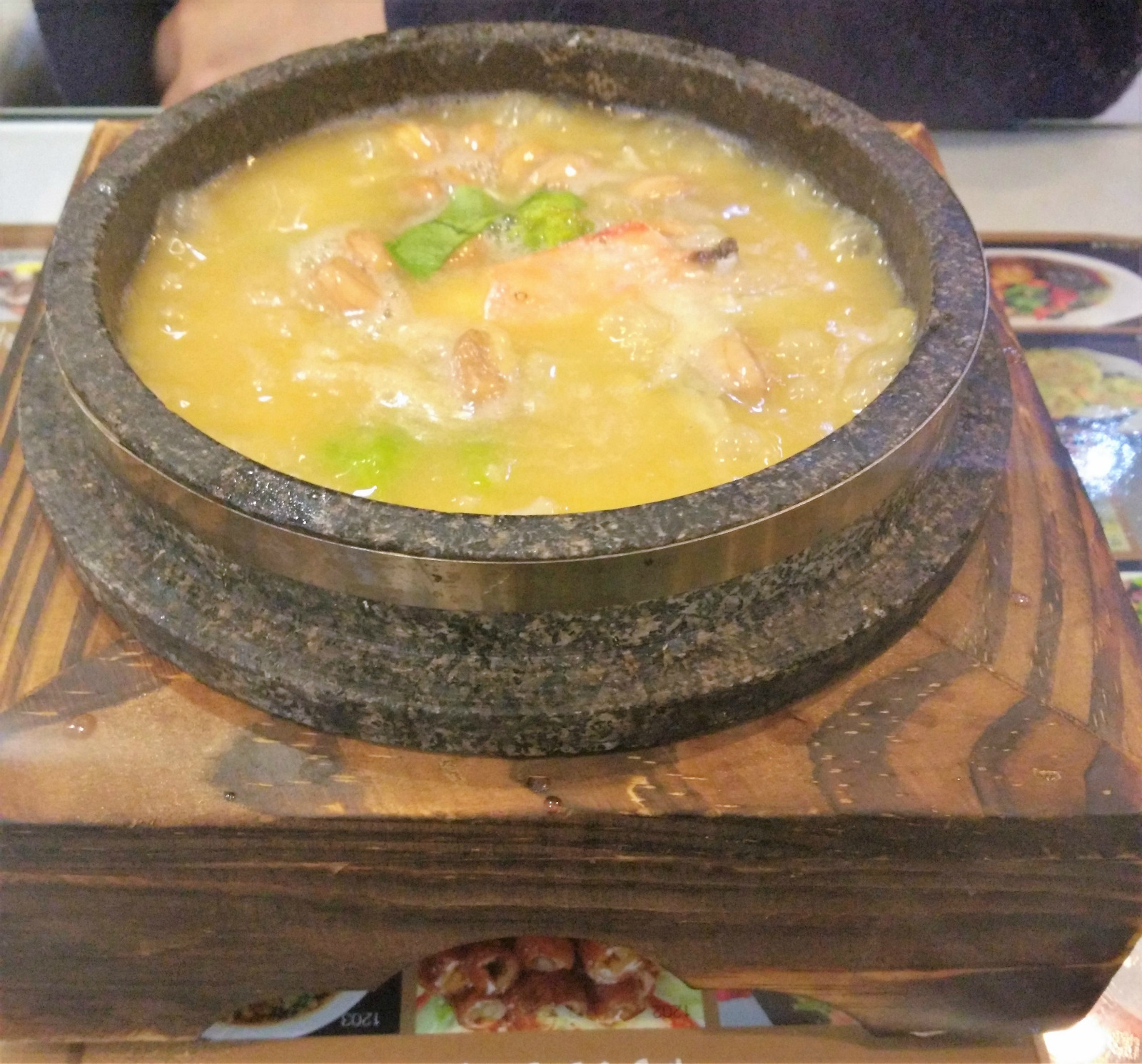 放在木座上的虾粥