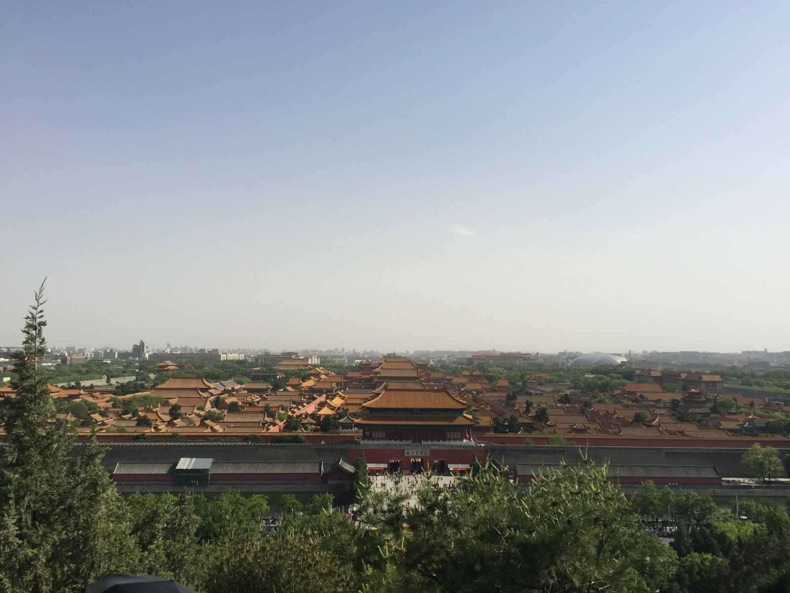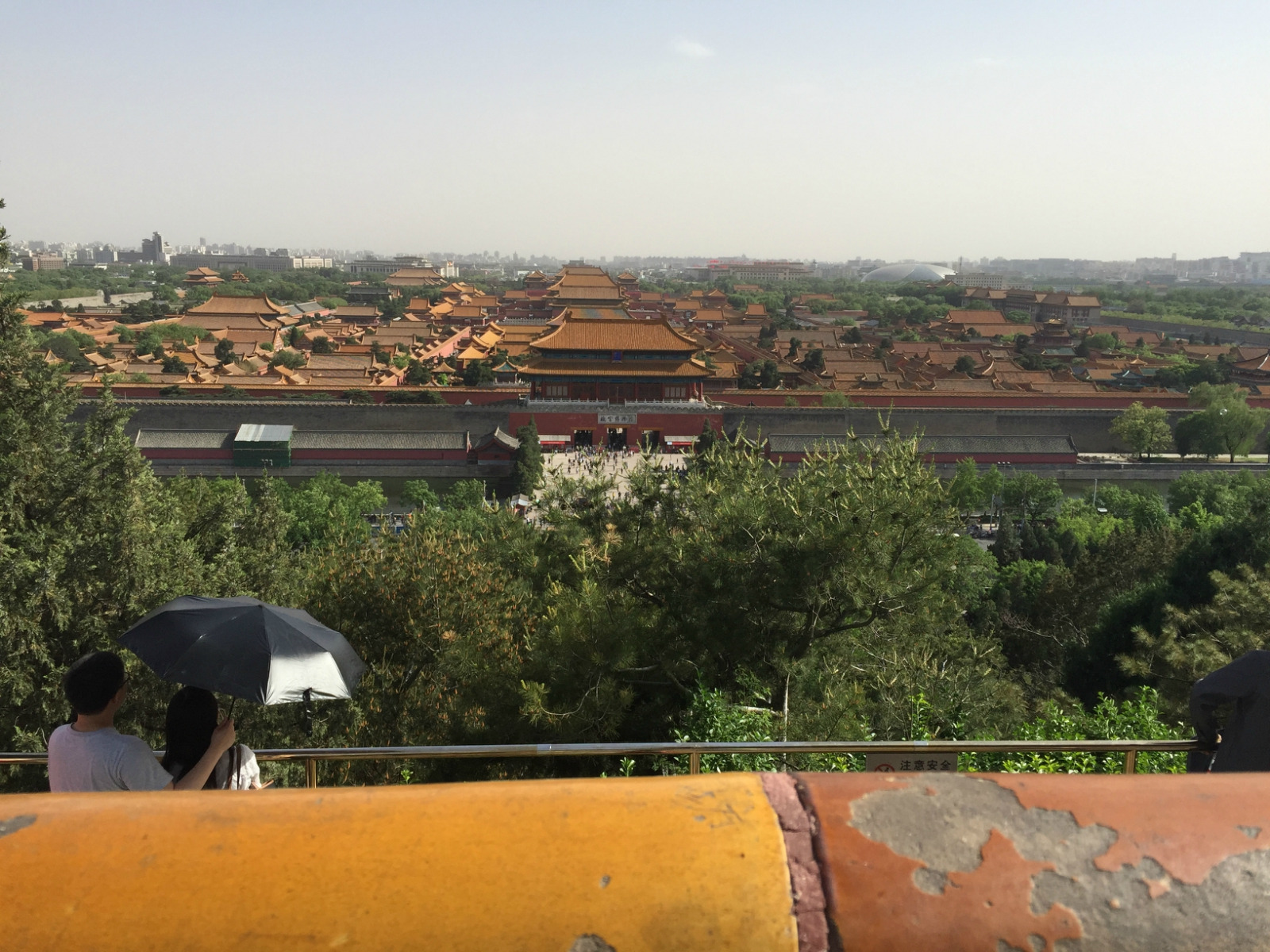 山顶上风好大呀,不过视野很好,北京的景一览无余,而且能够看到故宫全貌。在一片绿色掩映下故宫这一片黄顶红墙特别耀眼。