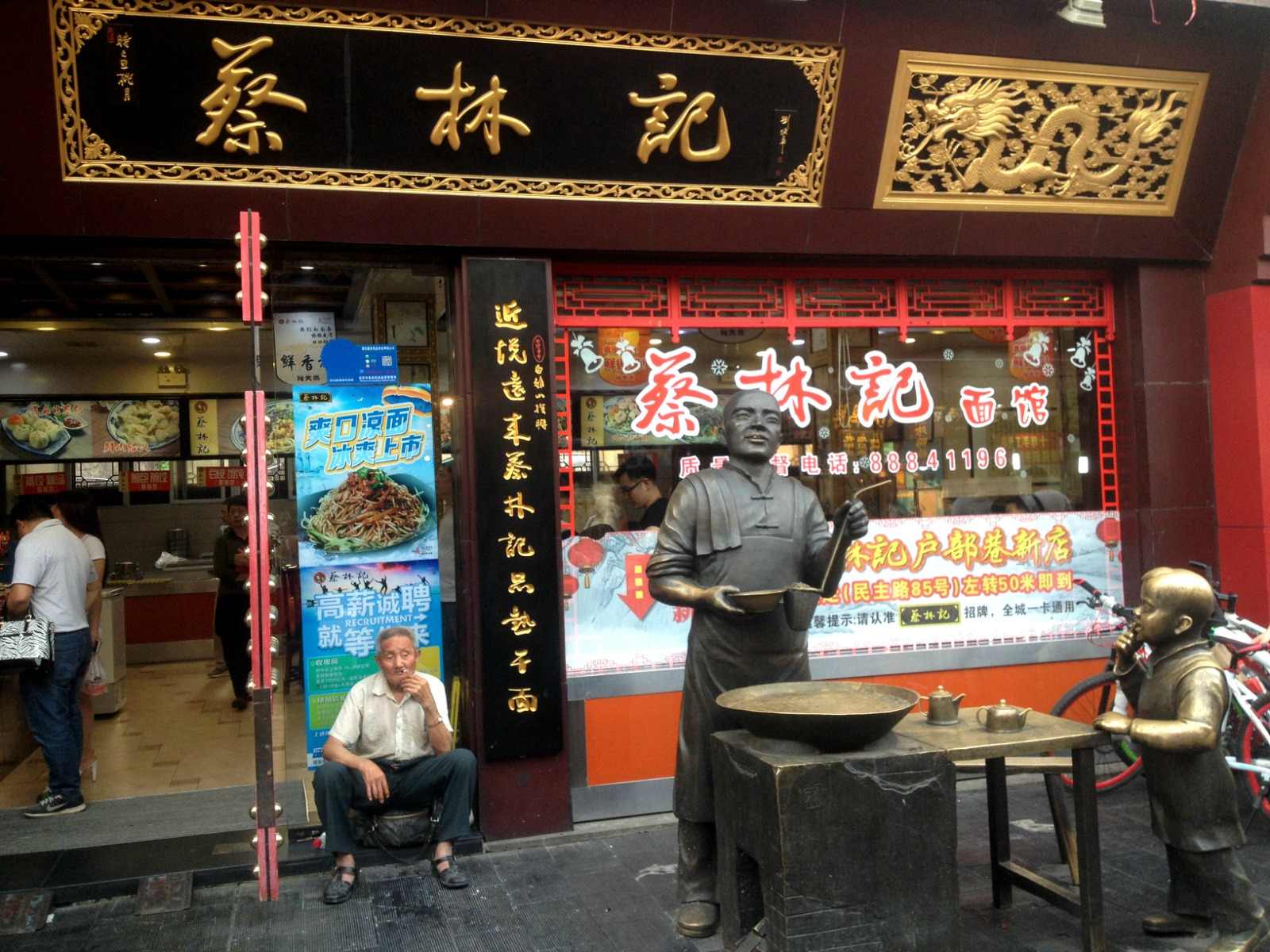 这个是蔡林记的正门口,此雕塑很具代表性,独一无二。其实开始时这一大一小皮肤都是偏黑的,然后被游客慢慢的摸金了,哈哈。每个路过不管吃不吃热干面的游客只要对雕塑感兴趣都会跑过去摸摸小孩子的头,然后就成金头了...