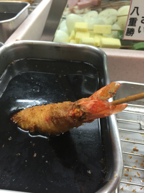 八重勝やえかつ,Yaekatsu,大阪市区非常有名的一家炸串店,仅此一家无分店,位置在城区偏南一些的天王寺、惠美须町商圈,如果你来大阪动物园、通天阁游玩,可以靠在这里吃一顿。由于超人气,不管是周末节假日饭店总是人头攒动,排队再正常不过了。所以午餐可能等位半小时,晚餐等位一小时左右。炸串主要有肉串、虾以及藕、花菜等蔬菜,人均一餐消费约150元上下,价格在大阪来说,价格还是比较合适的,主要是油质放心,菜品的分量也比较足。就餐环境比较挤,人挨人的,店员炸好后直接托盘而出,不要一下子猛吃可能会烫嘴,味道可谓十分新鲜。