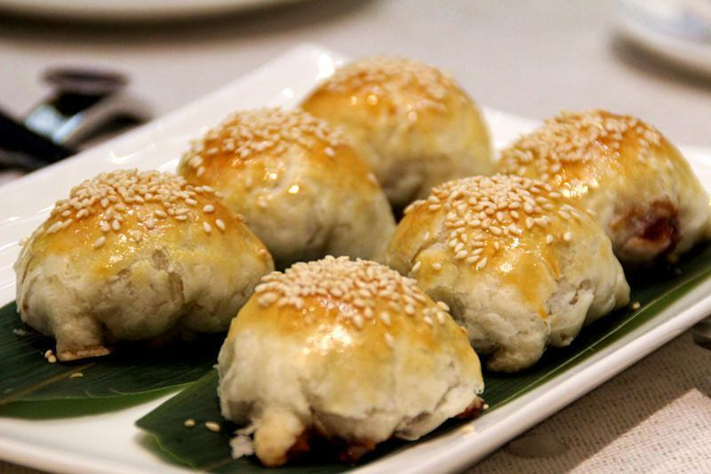 叉烧酥 香酥的酥皮包裹着叉烧肉,表面点缀着白芝麻。