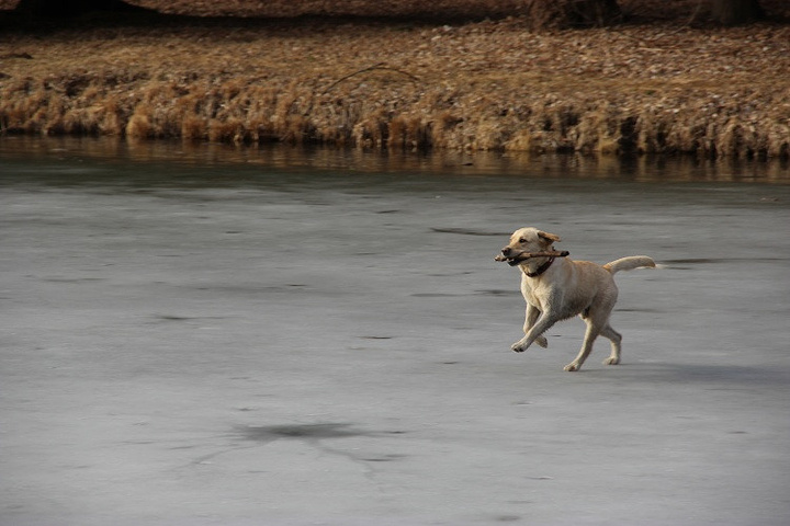 小狗狗的主人在远抛木条,小狗狗很快跑过去拾。