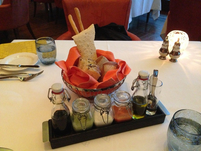 面包薄饼配各种酱,青蒜、番茄、青乳,还有黑醋、橄榄油,非常特别!