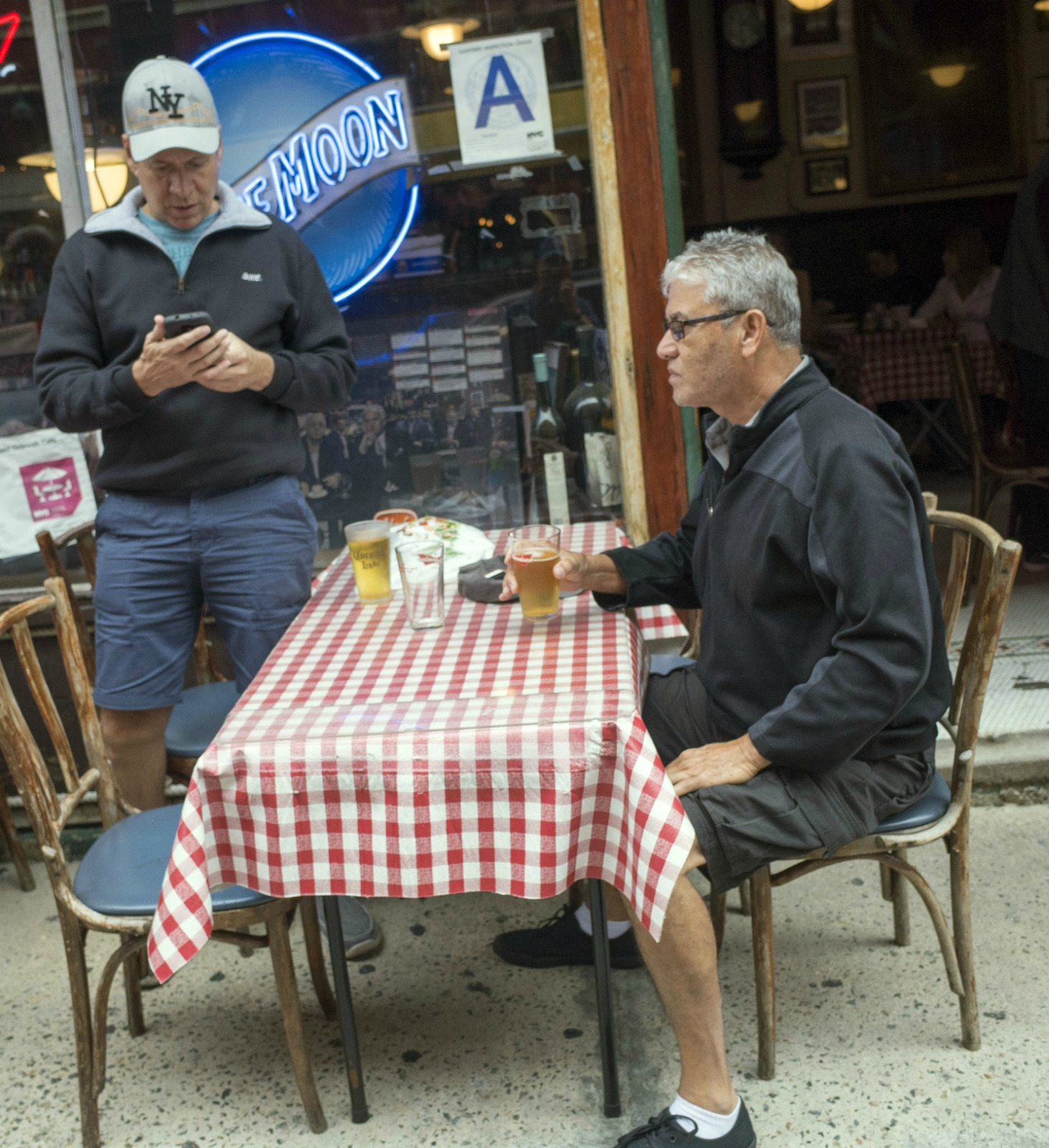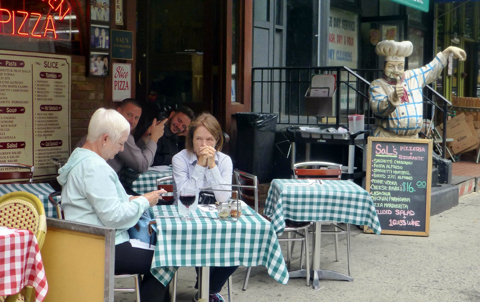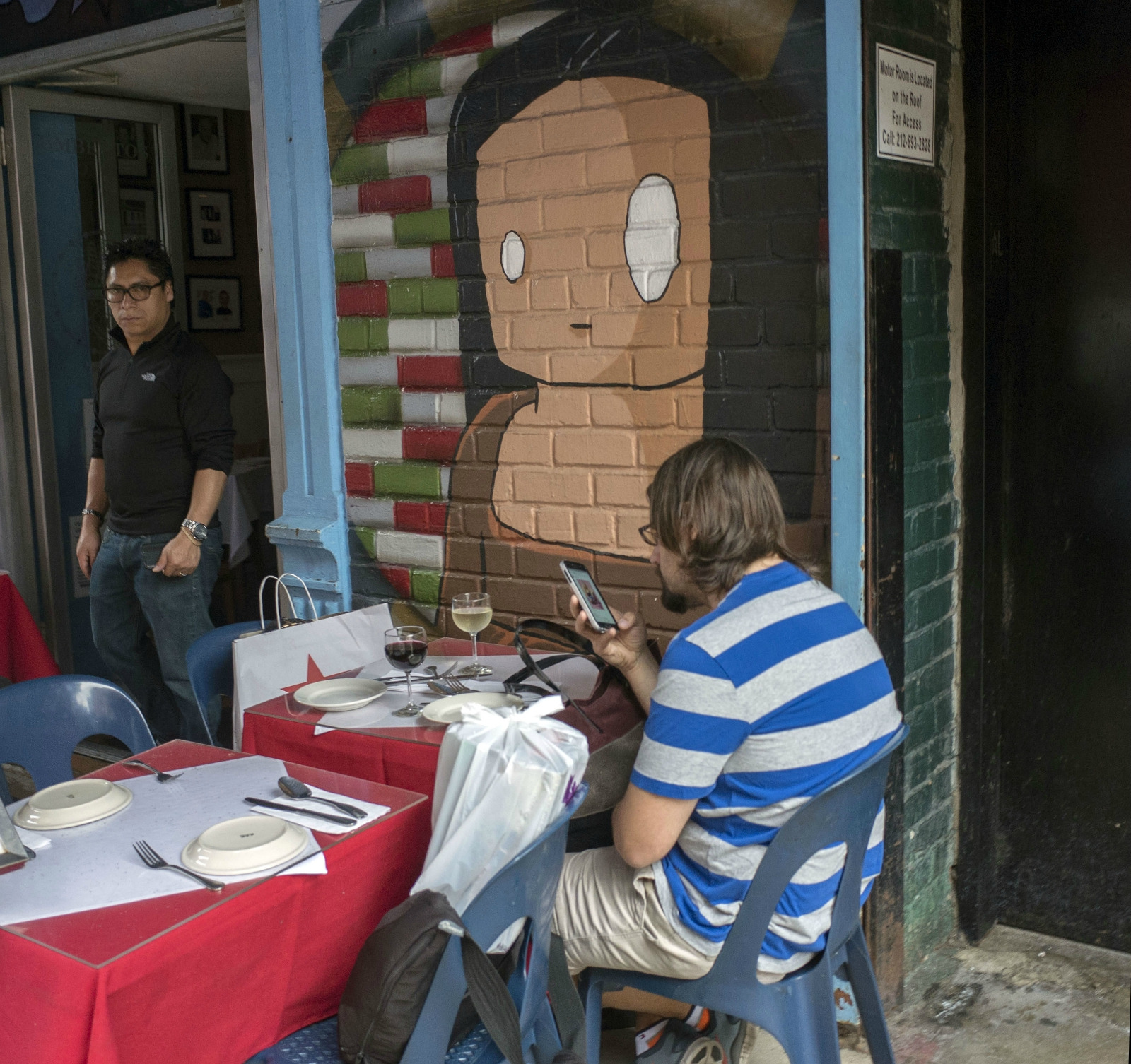 街道两边是一些小楼,很旧了。墙面的壁画生动夸张浪漫。纽约的老楼很突出的特点是外挂式逃生铁梯子。小意大利街区相对唐人街,安静,整洁,优雅。街面上最显著的是铺着格子台布的室外餐位。老外总是喜欢在太阳伞下喝一杯咖啡,或者吃一顿大餐,即使寒冷的冬天。坐在街上,边吃边聊,看着来来往往的行人,食客的身影没准也被摄入镜头。