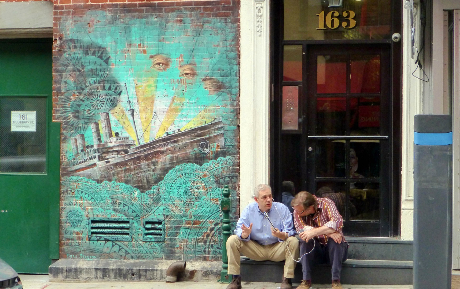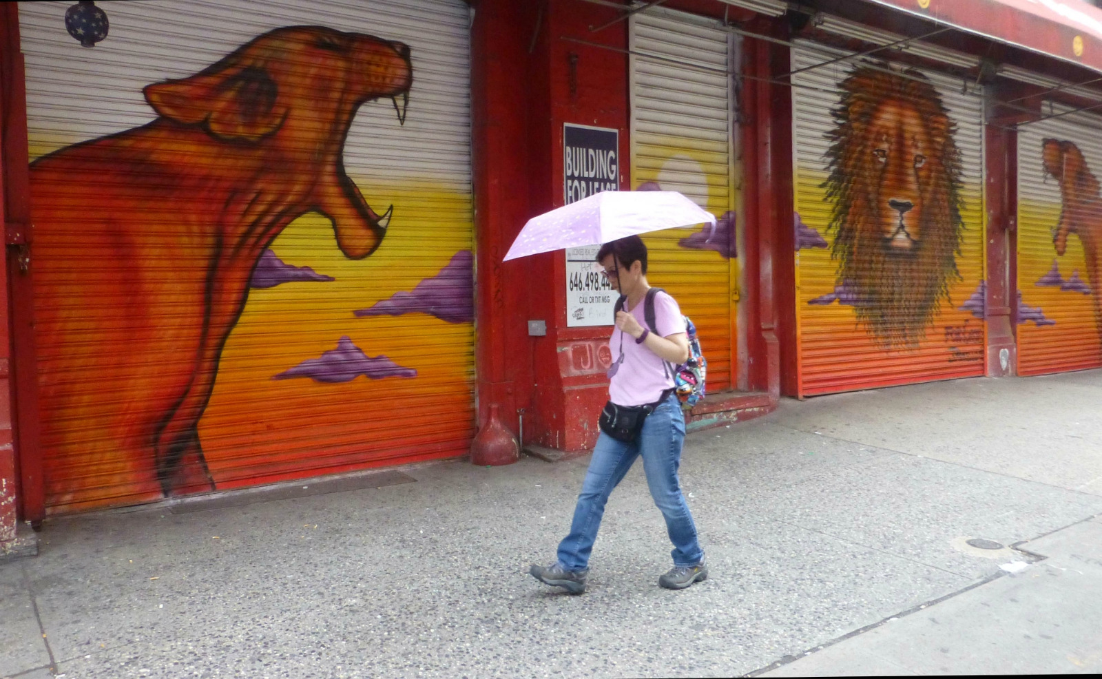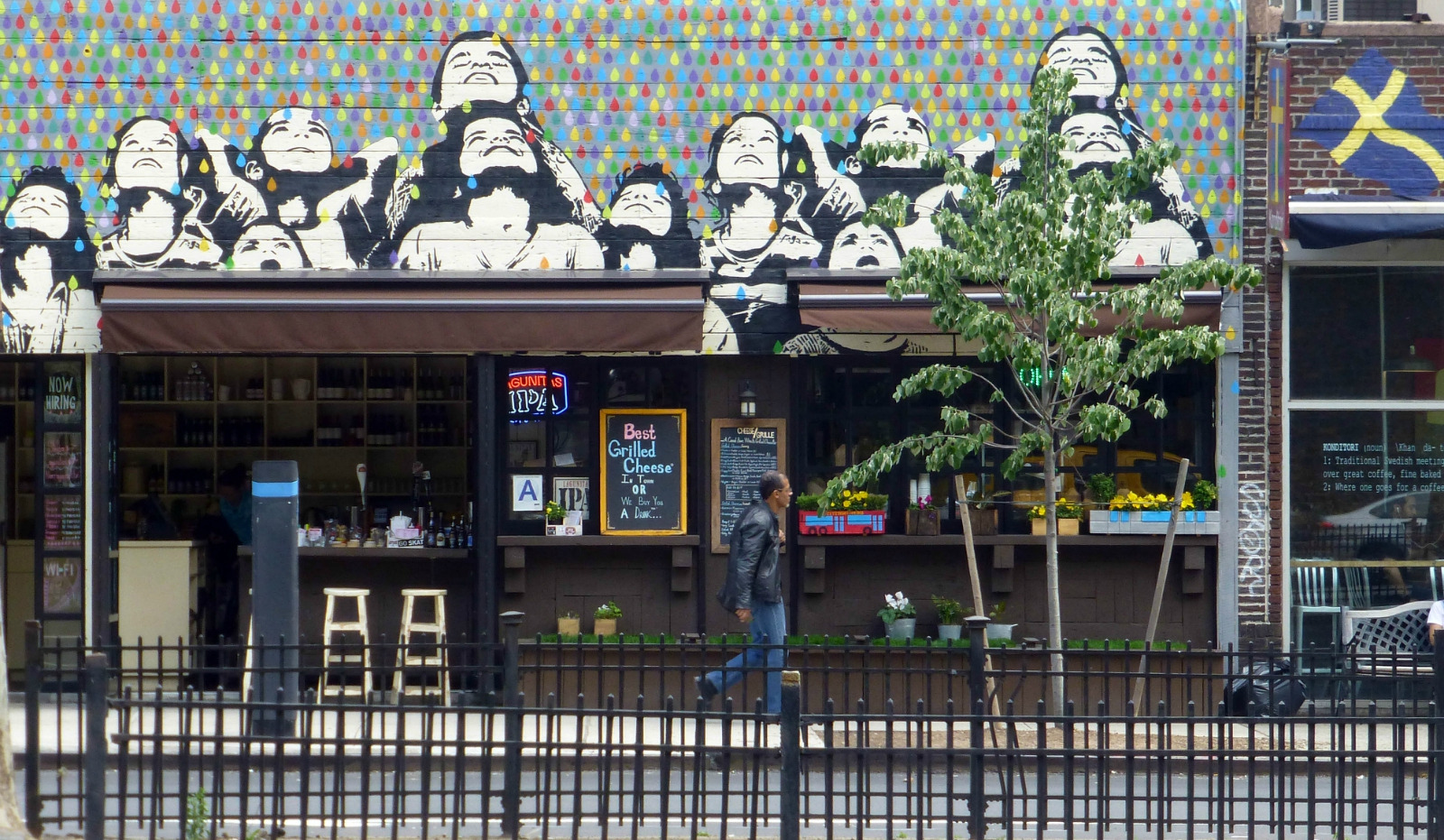 街道两边是一些小楼,很旧了。墙面的壁画生动夸张浪漫。纽约的老楼很突出的特点是外挂式逃生铁梯子。小意大利街区相对唐人街,安静,整洁,优雅。街面上最显著的是铺着格子台布的室外餐位。老外总是喜欢在太阳伞下喝一杯咖啡,或者吃一顿大餐,即使寒冷的冬天。坐在街上,边吃边聊,看着来来往往的行人,食客的身影没准也被摄入镜头。