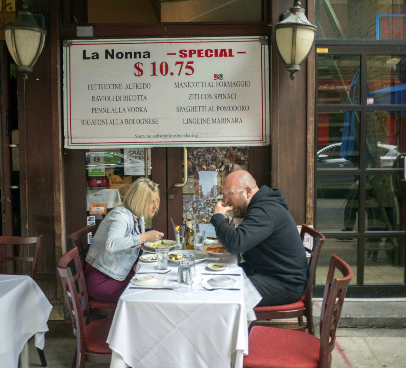相对说,小意大利的意式餐食比较正宗,价格不会太离谱,有很多懂行的意大利人常来。足量奶酪的沙拉,意面,披萨,甜点和意式咖啡是最普通的,吃一份比毗邻的唐人街正宗中餐还是要贵一点。但是各有所好,坐下来享受意式大餐的国人还是有的,任性一把嘛。