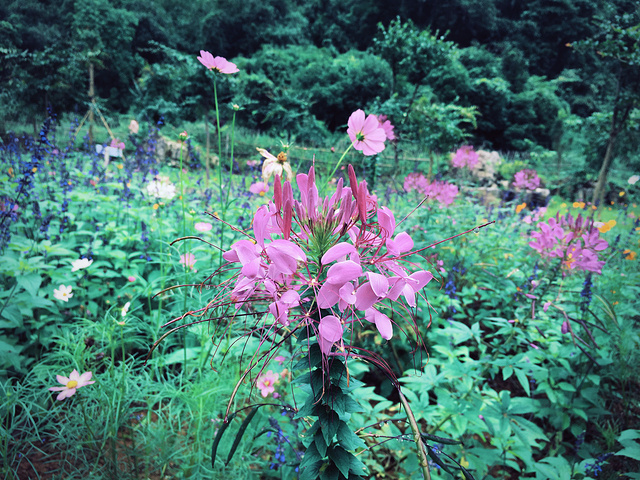 老大骑着小绵羊带着我,风飕飕的吹着有点冷。一路上有好多人骑单车,知道我们也租单车好了!但我知道骑上这路可费劲了!老大一路直骑我一路左看看右看看,突然发现有一颗开满花的樱花树!立马让老大调头我也去看花。来到九里花海苗圃门票20元/人,售票处还借道具伞,索性我就借了一把。一走进去感觉整个人都要飞起来了,整个画中景色就出来了,有山有水有花有蝴蝶~ 幸好没有错过这美丽的风景线!最吸引我的是那颗开满花的樱花树,结果走近一看原来是假的…… 不过幸好的是旁边的花海全部都是真花,有蝴蝶兰和商家招牌写的薰衣草,其实那只是一大片紫色的花海并不是薰衣草。这个地方是个拍照的好地方!由于下过雨的地里泥很松很滑不是很好走进去花海里拍照,我只能小心翼翼的走进去让老大赶紧帮我拍下来。这一百张的照片里起码还是有几张是可以见人的~