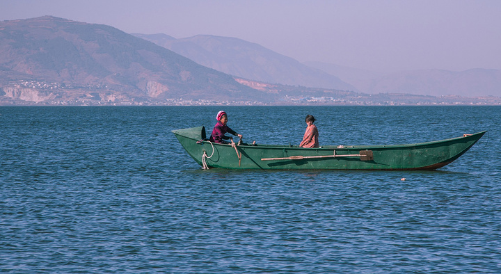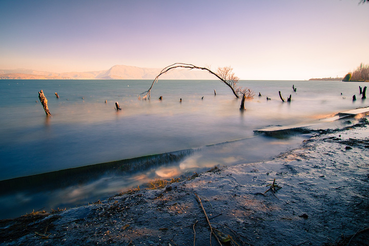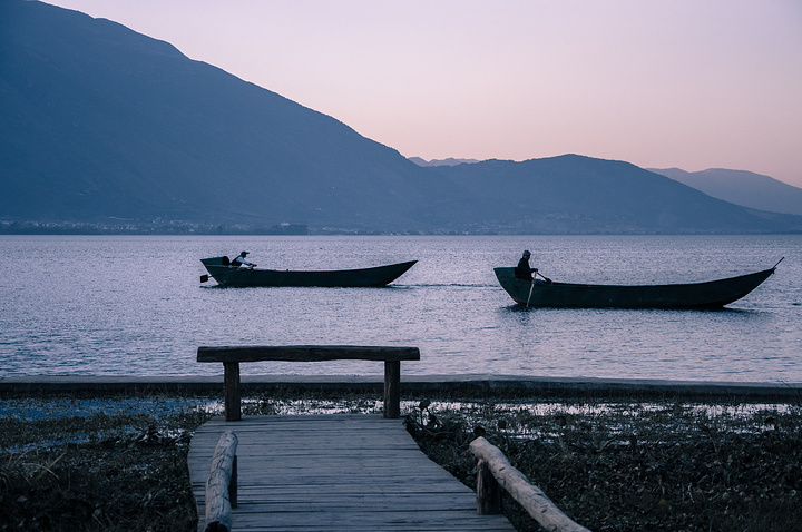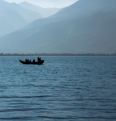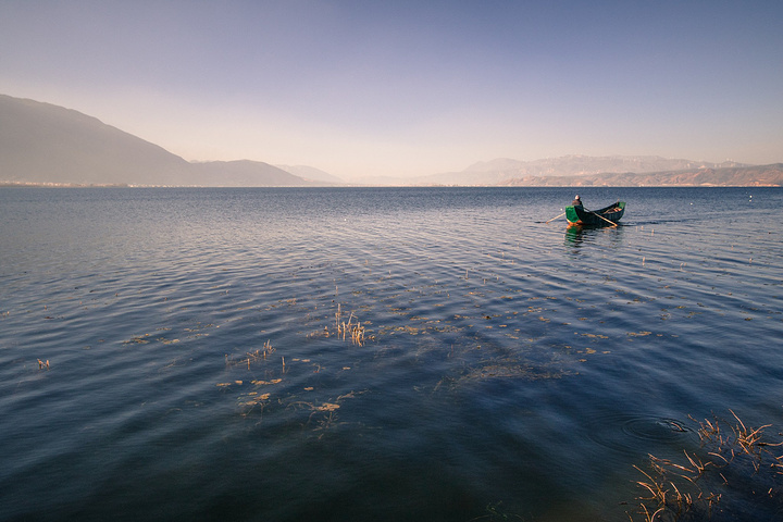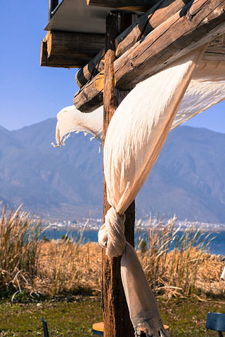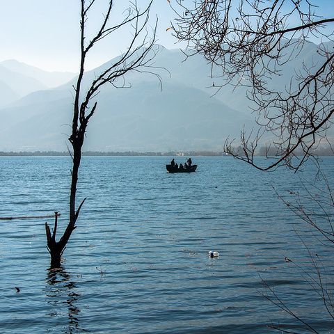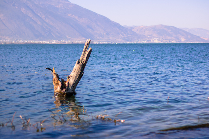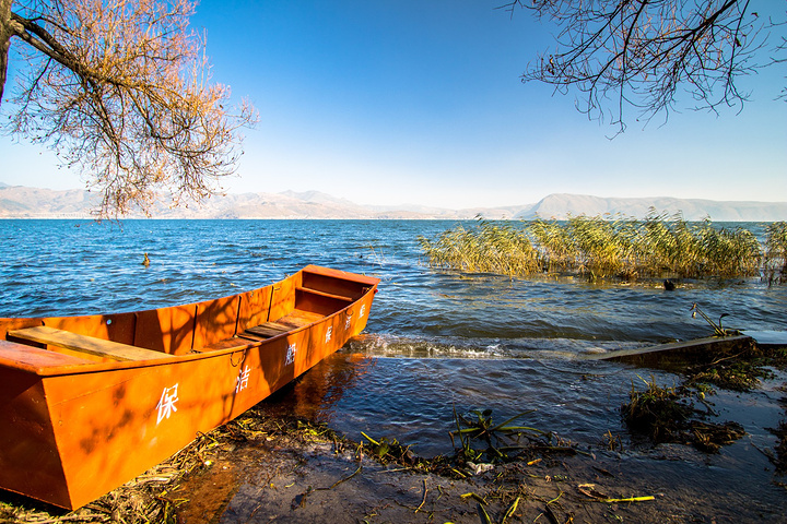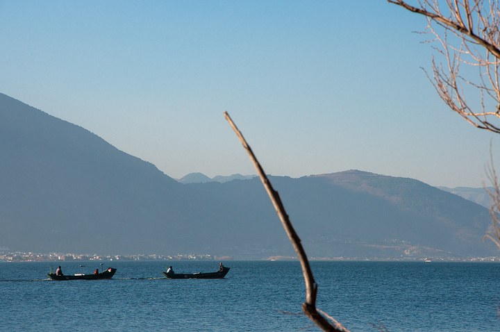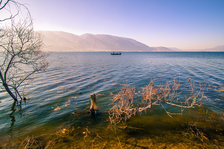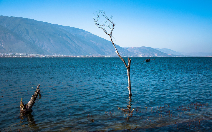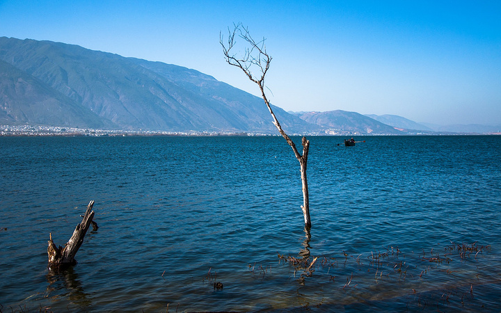 蓝天,洱海,苍山,枯树,破船。