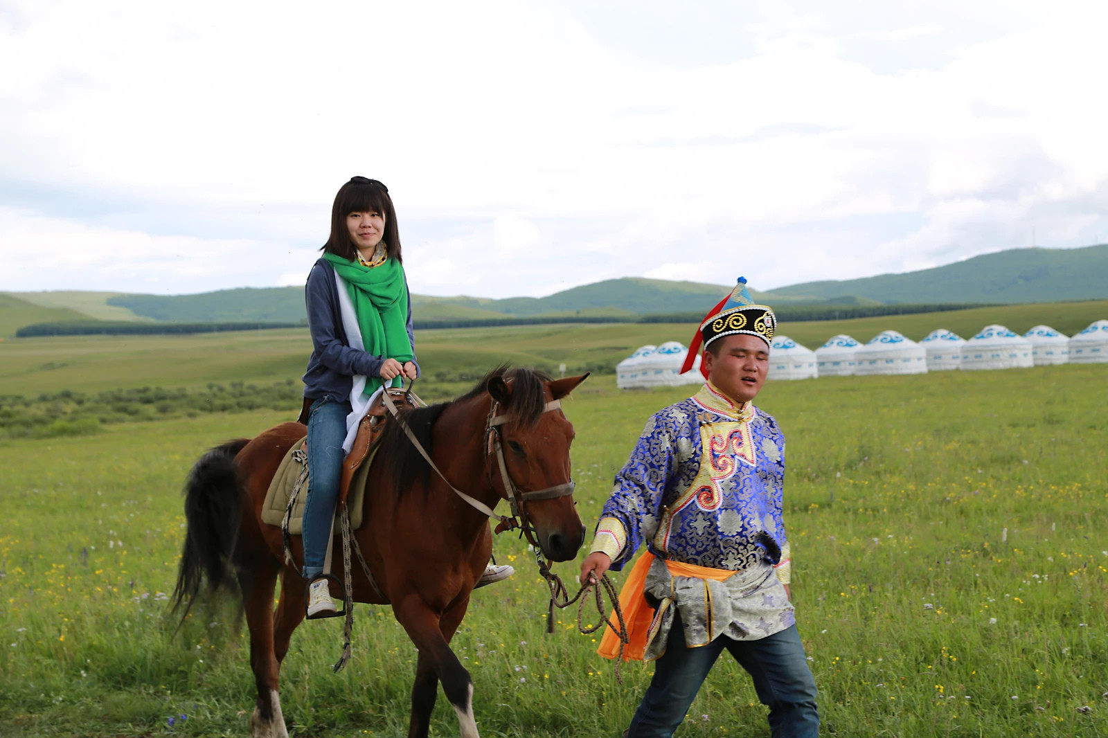 蒙古小伙子牵着骑马的美女,幸福得眼睛都眯上了(陶醉的样子)