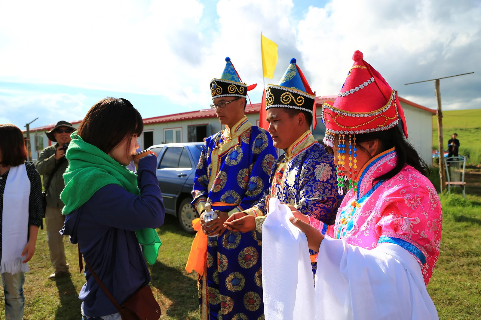 下马酒,敬献哈达。