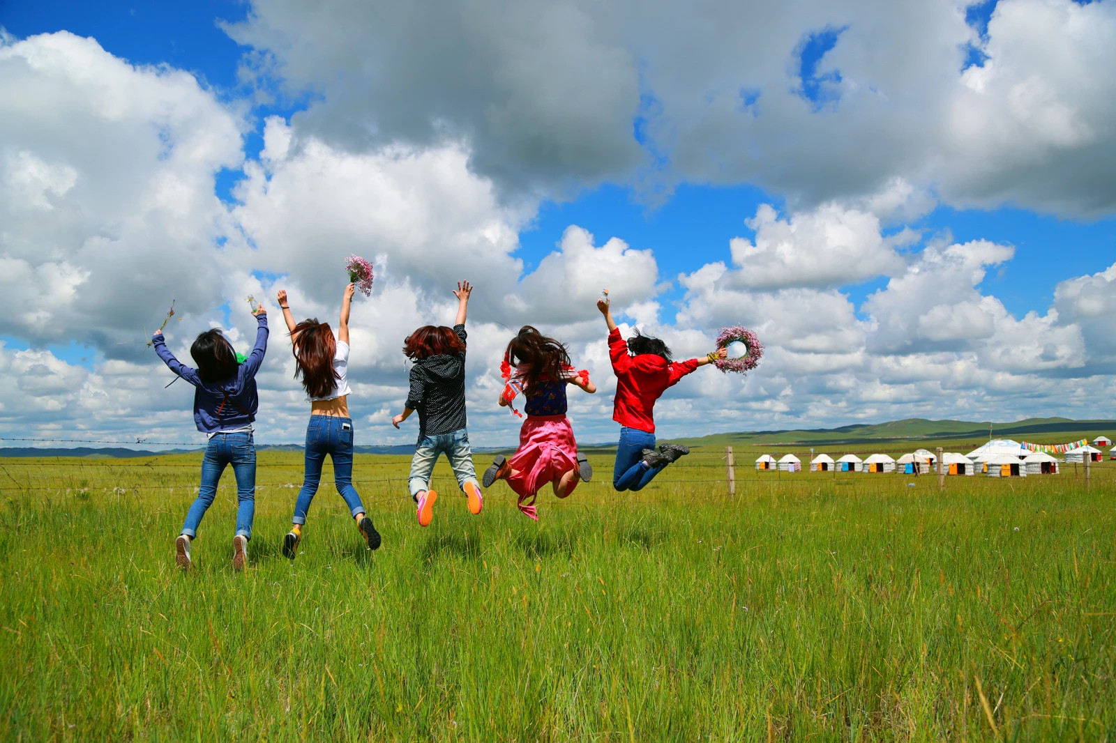 蓝天白云牛羊,草原马群毡房。牧童笛声悠扬,还有那,好姑娘。