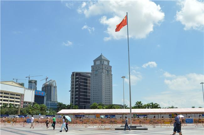 国旗高高在上,引导客流的护栏仿佛在述说着这里人来人往。