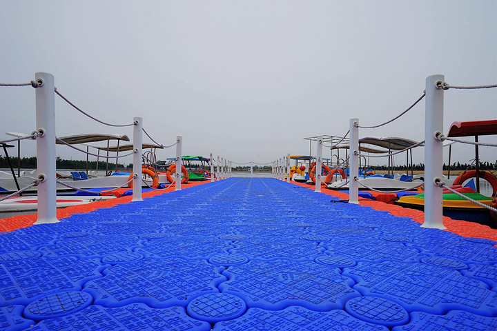 这里就是由上百个海水池塘组成的海洋牧场,其中这一个开发成了旅游专用的水上乐园,有电动车、手划船。