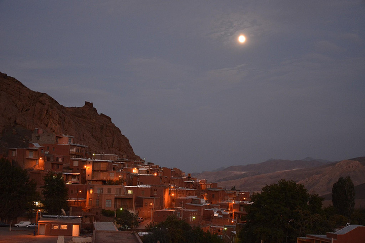 卡尚附近有个著名的花婆婆村阿巴扬奈(Abyaneh),很多人也冲着它原始的乡村风貌、有不少穿着花俏的老太太而慕名前往。卡尚到阿巴扬奈要走一段高速,再绕进扎格罗斯山里,原本安排行程的时候大概在下午四点到阿巴扬奈,在卡尚耽误了些时间差不多五点半才到,十月的伊朗五点半太阳已经下山,天也开始渐暗下来。整个阿巴扬奈也没有逛太多地方,但对于这个花婆婆村,个人印象也已不如前人所描述,商业化气息有所加重,在村外五公里设卡收门票50000R,村内也建起几座小旅馆,而且更多设施也在建设之中。在中秋节前一天,在一屋顶上,遥望一轮圆月出于古村落山间,又是一次只留匆匆一瞥,回首却望不见花婆婆来往,不清楚将来会有多少改变,而存在我记忆中的阿巴扬奈,也仅有那依山的红屋。