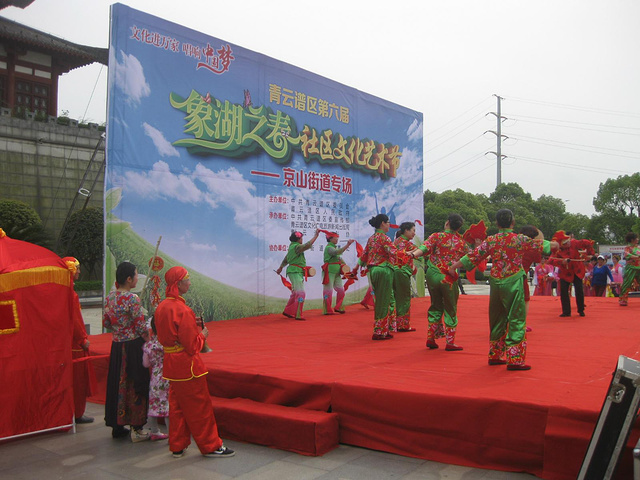 南昌市博物馆 25路公交 八一馆——将军渡 南昌市博物馆 本以为会在市博消磨掉一两个钟头时间,没想到,不到半个钟头就出来了。 博物馆坐落在一座仿古城楼里。仿古城楼名灌婴城,承载着南昌2000年的建城史。汉高祖五年,大将灌婴奉命进驻南昌,设豫章郡,建南昌城。建好后的南昌城被后人叫做灌婴城,是南昌地区最早的一座城池。 城楼前有一个不大不小的广场,我们去的时候,一场自娱自乐式的社区文艺演出正在这里举办。红色的舞台搭起来,强劲的音乐响起来,一群打扮得村气十足、花枝招展的中年妇女在台上舞起来。一排桌椅摆在舞台下,十几位评委模样的领导专家坐在那里谈笑,大幅的宣传牌上写着:青云谱区第六届象湖之春社区文化艺术节——京山街道专场。舞台周围流动着时聚时散的观众。 过石桥,进城门,远远地就能看到墙上写着的那排字:地宝人杰——南昌历史两千年。博物馆不大,规矩挺大。工作人员不少,有效工作的少。进门时,保安检查身份证,没带不让进。进门后,自己去前台登记姓名和身份证号。前台后面,并排坐着三个正在玩手机的年轻姑娘,三只大屏幕手机照亮了隐在黑暗中的三张脸。 博物馆只有一层,实物展品少,多是文字和图片介绍。介绍了一下南昌市的建城史,展出了一些很一般的文物,如墓里的石兽、吉州窑的黑瓷盏、几根金簪、一张A4纸大小不知是真是假的朱耷的画。