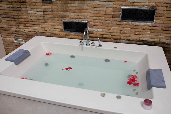 澡盆里放满了热水还飘着花,可惜从小只习惯淋雨,享受不了泡澡