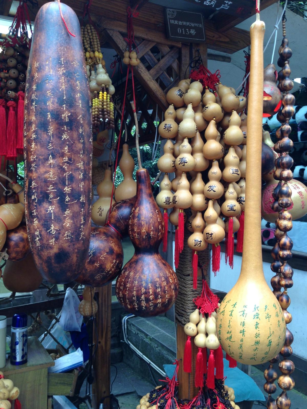对于旅游参观景点这件事,我这个人的原则就是看心情,所以游玩的时候,完全是随便乱逛,四处乱看,总觉这样完全陌生的感觉才是旅游的真味,既是为了玩,就以随便的心态仔细的看。初入锦里,马上就被路边卖糖人、手工艺品、编织品、纪念品的各种小摊吸引了,这里的扯线人、剪纸、骨雕、糖画、叶画什么的,还有成都特色的变脸脸谱以及皮影,一下子都让人应接不暇,眼花缭乱了