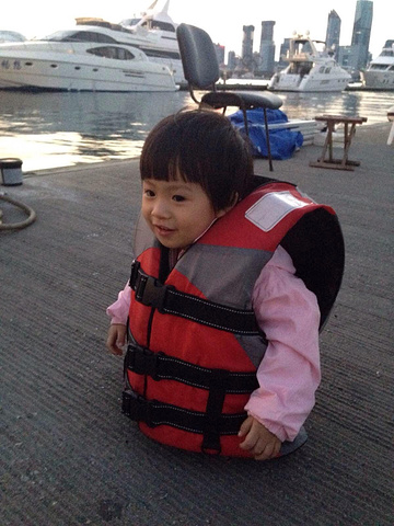 穿上救生衣的荀 说要拍照 就调皮地蹲下来 变成小乌龟了