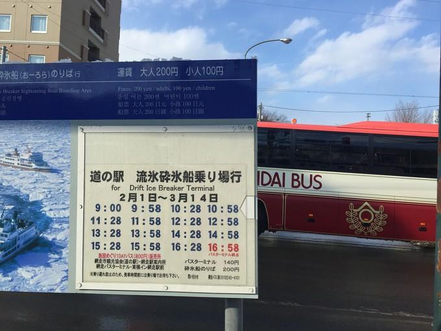 一早去网走的火车延误了2个小时,大雪天就容易遇到这样的事情。好在旭川的雪停了,车站后面的风景还不错~随遇而安吧。到了网走,车站门口就有车站。可以到海港、监狱等景点。也可以在这里坐巴士去知床斜里或宇登吕。时刻表就在上面,咱们说走就走~ p.s.到了网走后天气就一直很晴朗~