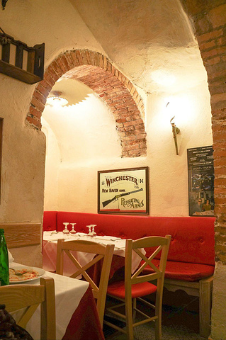 这大概就是小拱门名字的由来吧 没想到这个点了还在等位,就,再次验证了欧洲人真的都是站在门口傻傻的等位,你们不会叫号啊! 门口的橱窗里是菜单,老公说你去看看想吃什么,可是可是,臣妾看不懂啊TT 在负一楼就坐,这里像窑洞一样,灯光很暗,手机完全没信号了。 完全按照攻略点菜,因为,菜单完全看不懂:) 隔壁桌是两男两女四位韩国人,一个姑娘特别漂亮,另一个就是典型的韩国人。出了亚洲,真的是一眼(我的水平大概80%)就能分出中日韩三国人。 最神奇的是他们点了两个披萨两份意面,披萨是放中间一起吃的,意面居然两个姑娘一人一份小伙子们没有!