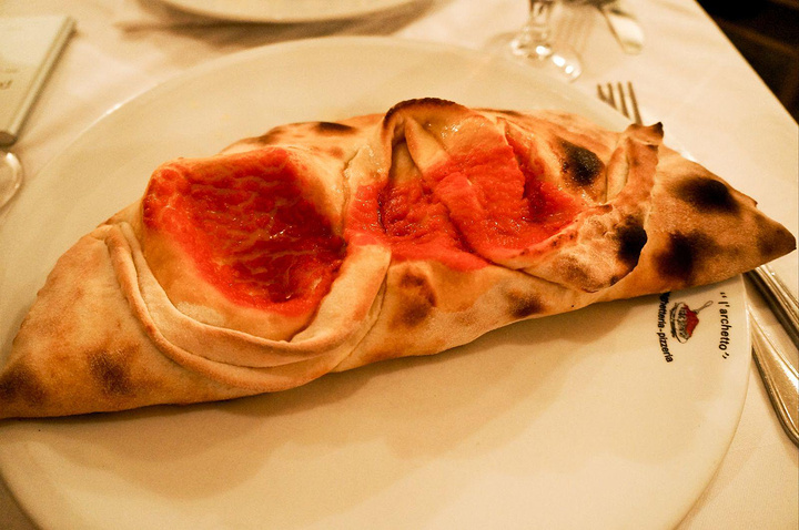 据说口感略微有些辣,但我并不觉得辣),一份大馅饼Calzone(包着蕃茄、香菇、火腿、乳酪、鸡...