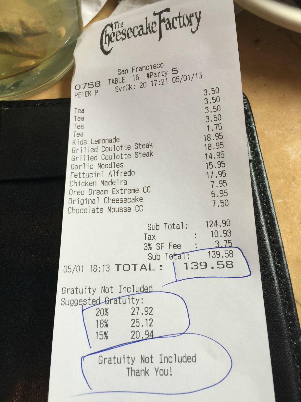 这里的结账单上是有明确的用餐费用+税+小费(各个比例的小费都算好了,很人性化。)