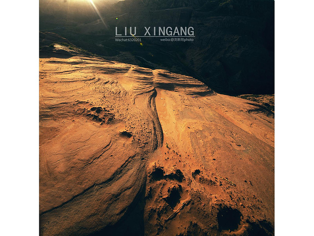 靖边的波浪谷也有着与美国波浪谷媲美的红砂岩峡谷。中国靖边波浪谷和美国波浪谷的差距并不大,都是红砂岩地貌,靖边波浪谷更加年轻,只有6000万年,很多砂土还没来得及凝固为岩石,它的名字叫陕西靖边龙洲峡谷,地处黄土高原与毛乌素沙漠交汇地带。 波浪谷,实际上是一种特殊的丹霞地貌,历经数千万年地壳运动,沧海桑田的时光和流水风沙的雕琢,生生的在那些色彩艳丽的岩石上,风蚀出了像波浪一样,一圈圈一层层纹路的山谷。 在美国,波浪谷每天只允许20人进入参观,而中国的靖边波浪谷目前还没成为著名的景点,也没有像美国那样一票难求,可以亲自走在期间,亲手抚摸"时光纹路";