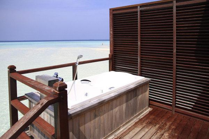 按摩浴缸是这次水屋的特色,但是由于家人有洁癖,所以我们并不敢轻易尝试,夜晚在星空下沐浴,盛情的被海洋包围,真的无比浪漫,虽然这完全是开放式的浴缸,但是完全不必担心被人看到,因为水屋设计的角度刚刚好,我们在屋里的人看得到宽敞的海景,但是却看不到周边的邻居,私密性超强。