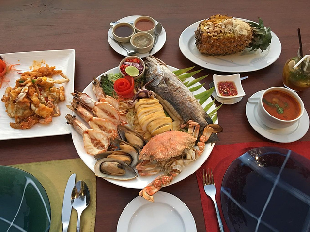 晚饭:海鲜拼盘 + 菠萝饭 + 咸蛋黄炒蟹 + 冬阴功 + 莫吉托 这是海鲜拼盘,最贵的1500铢,心在滴血,不过分量真的很足,三个人吃都可以了。 其他菜200、300铢(是我们旅程吃的最土豪的一次),正宗的冬阴功千万别点,又辣又苦。
