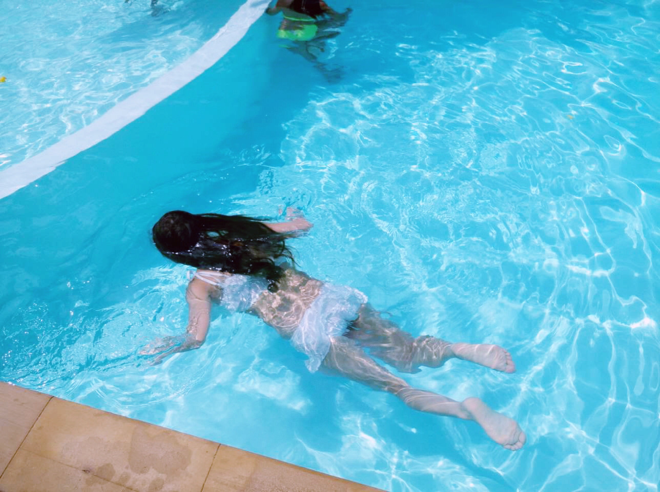 吃完早餐后,九点回到酒店游泳,我不会游泳,另外一个妹纸就教我游,