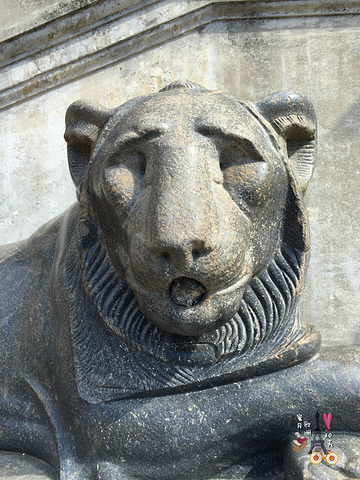 青铜松果前两旁镇守的古埃及石狮子像,来自公元前4世纪的埃及第33王朝。