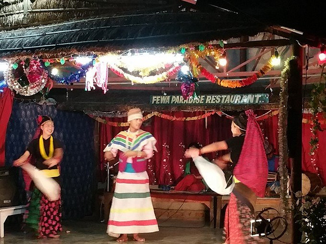 当天晚上和小伙伴去了博卡拉比较有名的餐厅,那里还有歌舞表演,边吃饭边看表演这待遇我也是很喜欢的,餐厅的名字在照片中已经显示,人均消费在50元人民币,是不是很赞。味道都很不错呢,白色的饮料我每次都是必点的,每个餐厅也都是有的,很爱喝,有点像酸奶。餐厅的舞蹈演员都很欢乐,感觉跳舞就是在玩,是在放松,而不是一种工作,吃完了有点饱,我提议去湖边走走,餐厅紧邻湖边,以为湖边也是这家餐厅的,所以拿起我的饮料边走边喝,湖边有一根长长的木栈道,看着满天星空,听着湖水叮咚,喝着手里的饮料,心情是异常的好啊,当小伙伴提议走了的时候,突然发现我手中的玻璃杯,一脸不可置信的看着我,怀疑我怎么把人家杯子给偷出来了,想喝的话直接在店里喝啊,你拿出来干嘛,又不是不等你喝完,我哪里知道餐厅是开放式的,没有门,走到湖边就可以走了的节奏,要早知道是这样,我还不吃霸王餐啊,哼哼,恨恨的把饮料喝完,再原路返回把杯子还回去,在小伙伴一路的嘲笑中赴昨日之约。和唐卡老板继续吹牛,他知道第二天我们要走了,拿出手机又互相加了微信,表示以后到中国会来找我们,感慨了一下,微信真是牛啊