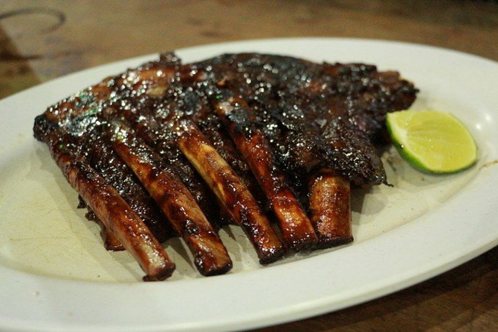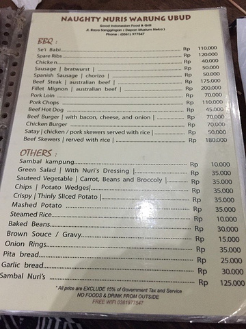 晚餐:Naughty Nuri's Warung 烤猪肋排 地址:乌布 Jl. Raya Sanggingan, Desa Kedewatan 晚餐在这家吃,这是巴厘岛人气超高的一家烧烤店,也得到很多巴厘岛本地土著的推荐,特别是烤猪肋排和烤香肠,这么有名当然要去吃! 餐厅就在马路边上,一下车,门口现烤的香碰碰诱人的烤猪肋排,我们就振奋了。