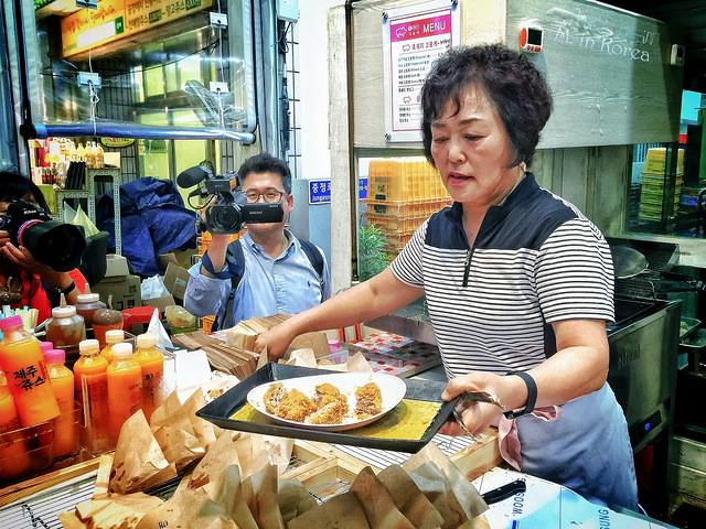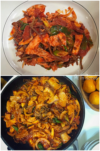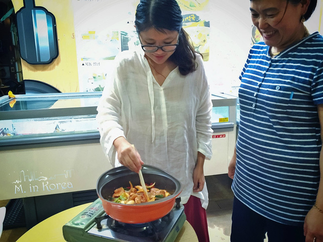还有就是市场门口的一家专门出售深加工黑猪肉的店。新鲜的黑猪肉,搭配洋葱、蕨菜、杏鲍菇、葱段和红绿辣椒,佐以由当地特色柑橘“汉拿峰”调制的甜辣酱一起翻炒,在好客老板的邀请下,我也上手翻炒了几铲子,这香味简直分分钟把口水勾了出来。