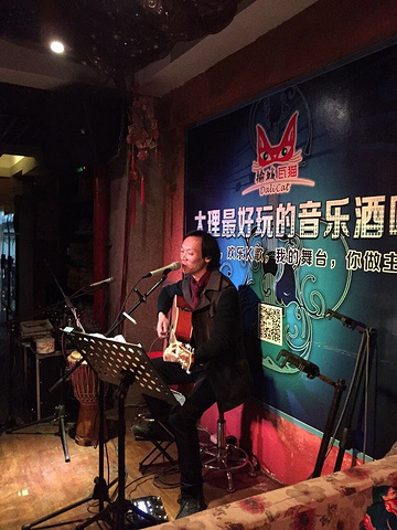 这里不得不说的大理两只瓦猫,一个是指瓦猫酒吧。也是群里的一个小伙推荐的,民谣清吧类型,老板是大理本地人,唱歌很用心。应该说非常喜欢这种类型的酒吧,静静的弹吉他,听歌,喝些小酒。我是晚上8点左右到的,大概8点20分开始,第一首吉他弹唱来自一位广东的帅锅,歌名《我如此爱你》哈哈,缘分! 点了“风花雪月”,点了瓜子果仁,要了壶普洱,慢慢的听,静静的想,一直坐到了子夜,老板娘说古城12点以后要静音,不允许有噪音。所以他们每晚过了凌晨会关闭门窗,燃起火坛,客人们就围坐在火坛旁,老板弹吉他,邀请每人把酒言欢,唱歌。由于当晚身体不适很可惜提前离开了。下次有机会还会去听。另外很意外的碰到一老乡,也是该酒吧的驻唱歌手--乔,一个有故事的男人。一个非常像林志炫的男人。呵呵