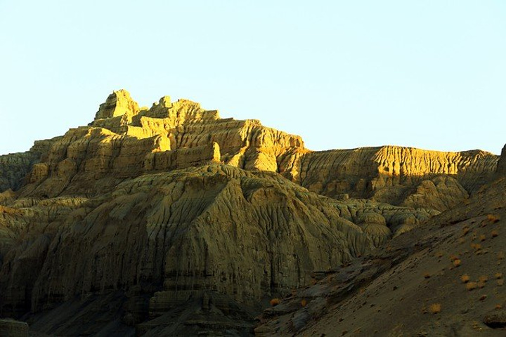 离开普兰,重新路过鬼湖、圣湖,我们便踏上了一望无际的荒原连着荒山的路程。下午六点多,师傅指着路途前方远处一大片青灰色说,那就是土林。 在阿里这块广袤的土地上,扎达是地形地貌最特殊的地方。据说在一百多万年以前,扎达到普兰之间有个方圆500多公里的大湖,后来经过喜马拉雅造山运动,使本地湖盆升高,水位线连年下降,逐渐将陆地冲磨出各种各样的层状,各种各样的形状,在很多土林的身上,都还能看见一层一层的水位线的痕迹。经过数十万年风沙雨雪的侵蚀,这一大片“过去的海洋”,逐渐变成了雄伟壮阔、高低错落的土林的海洋。这海底地壳的剧烈运动,让扎达被土林围绕在中间,见证着沧海桑田的变化。