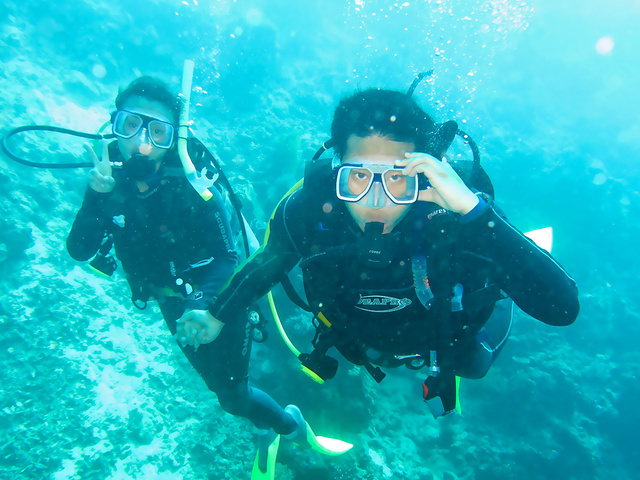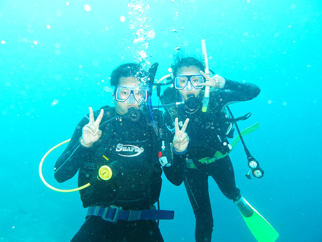 爱潜每天都会有固定的两个岛,按周循环。我们今天所遇到的就是邦邦岛和马达京岛。 到潜店已经有很多人等在那里,有些是去浮潜,有些是去深潜,我们船上大部分是之前一起学习的同学,虽然不是同样的教练,但是每天一起出海,已经很熟悉了,加上昨晚和另一个教练的两个同学一起吃晚饭,所以一上船大家就像朋友一样聊开了。 船开出去就把人家的小木船头撞掉了,感觉在仙本娜,这些有钱潜店的船就像海上小霸王一样,开得很快,还横冲直闯。看着那么小条船上那么多孩子,它们已经会很伤心,因为那是他们一家人谋生的工具。 今天两个岛离得有点远,差不多一个小时才到,船开得特别快,加上海上大风大浪,搞得整段行程我们就像在坐过山车似的,此起彼伏,心脏都快抖出来了,但是大家都很开心,很激动。听船员说,之前有一组人超级幸运,就在这片海上,突然一群海豚跳跃起来,跟着船前进。于是我们又开始幻想这样的场景了。 终于到达邦邦岛,说实话这里的海底让充满期待的我们多少有些失望。因为鱼类供不应求,这里的渔民就开始炸鱼,炸死了鱼鱼,炸死了美丽的珊瑚。虽然我们见到了大片大片美丽的玫瑰珊瑚,海兔和小丑鱼的种类也很多,可惜大部分时候看到的却是堆满死珊瑚的沙地。