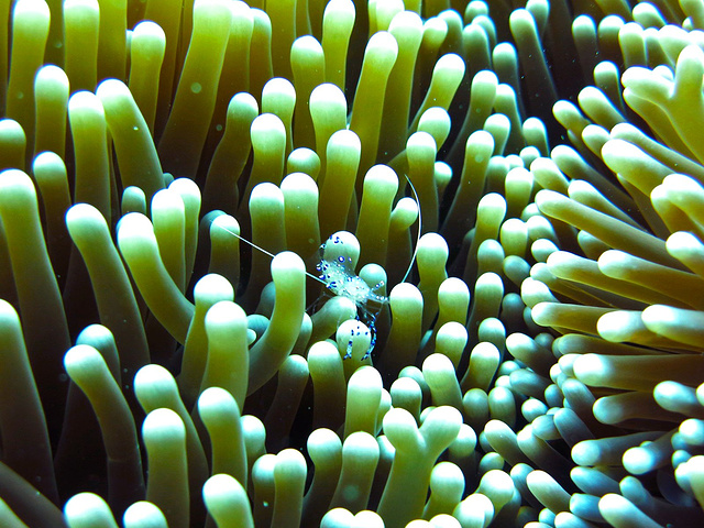 而且对于我们这种新手,下水还在学习,更不可能用超强的中性浮力控制住特别仔细的去看小生物。 当第一潜上船之后,我们看见一个AOW学员带着他配置很好的相机拍出海底世界精美的鱼群和珊瑚种类,各种羡慕之余,也不得不惊叹。我们看的是海底宏观,而高手拍的都是海底世界的微观。 透明的是小海虾