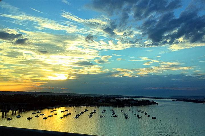 科罗纳多岛与圣迭戈一桥相连,开车穿过科罗纳多大桥便是科罗纳多岛了。而科罗纳多大桥也是从一定高度俯瞰科罗纳多岛一侧的绝佳位置,如果允许停车,我估计桥上会站满了游客和拿着长枪短炮的人们。 大桥是弧形,在桥面最高处有一个大弯,随即科罗纳多岛便呈现眼前。行使在上面便可将湾区的景色尽收眼底,与碧海蓝天相邻,湾区停泊的帆船是一道非常靓丽的风景。