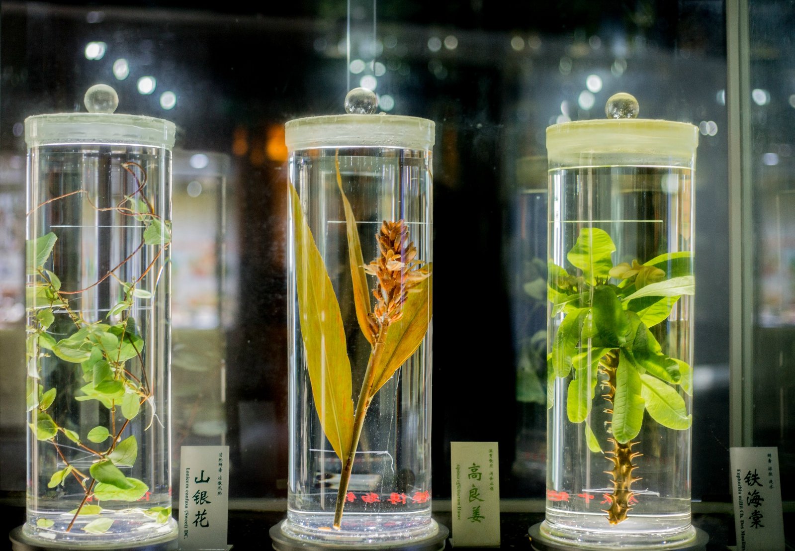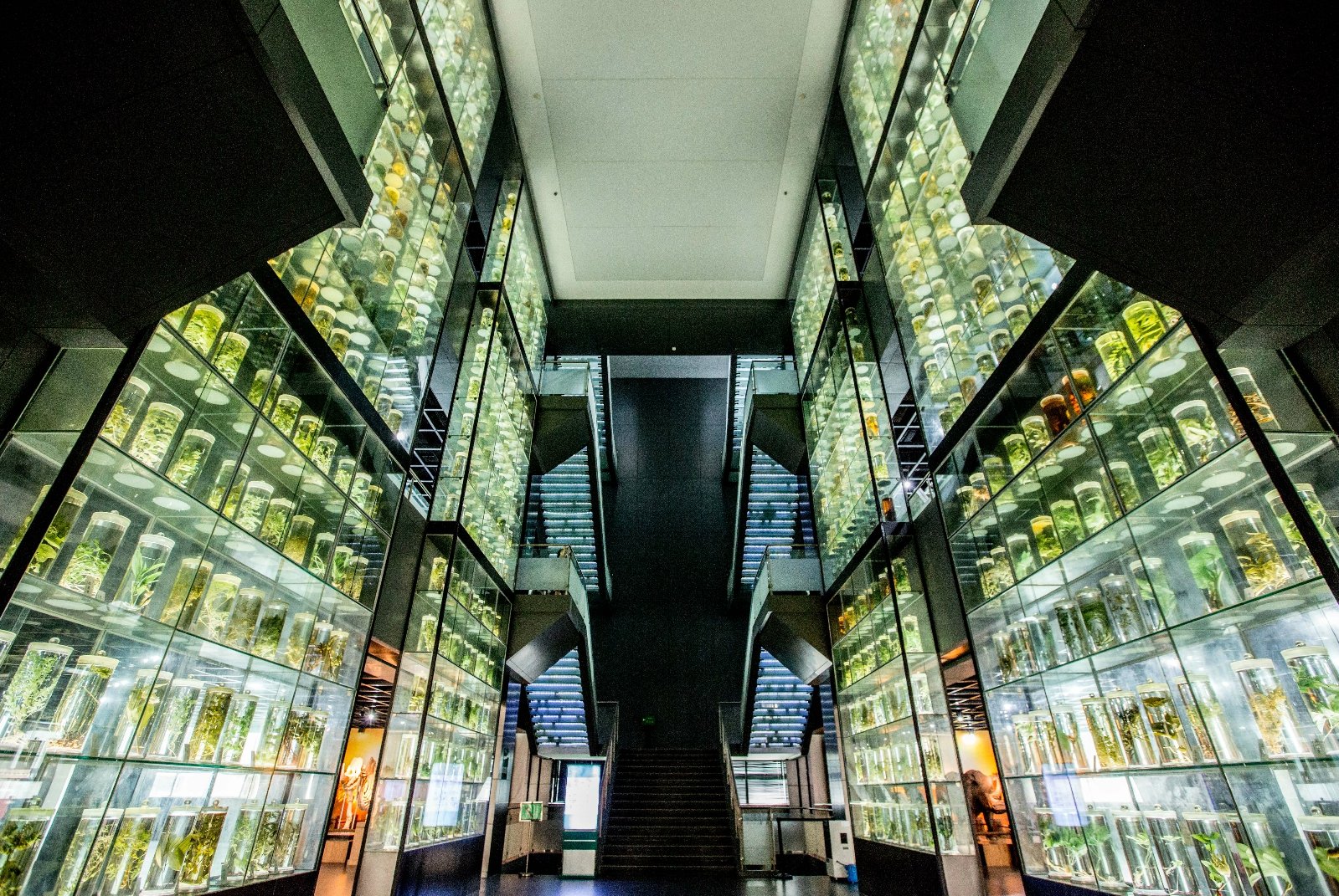 逛完种植着各种神奇药用植物的小山坡,我们便来到了广东中医药博物馆的一楼大厅,贯通3个楼层的600瓶岭南中草药原色液浸标本让人叹为观止。