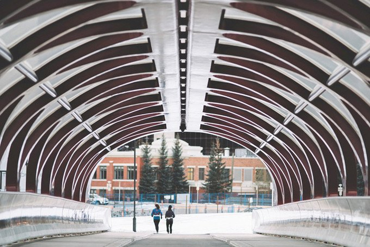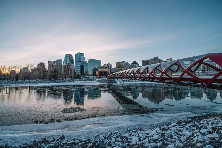 在晨曦中,参观2012年竣工的卡尔加里和平桥 peace bridge,这座大桥由圣地亚哥的建筑师Calatrava设计,连接北岸市区,只供行人和自行车使用,是座极具感情色彩的建筑地标。