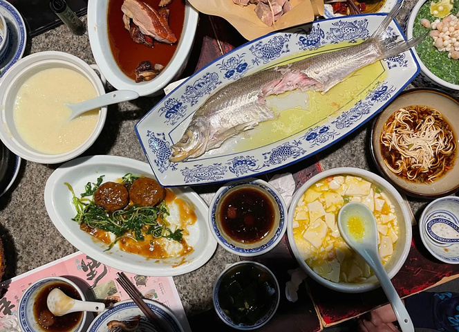 南京大排档还是那个排大长龙的大排档。我们从家出发前,就先打电话问能不能提前拿号,服务员说不行,然后我们家的两宝。先行去取号了,因为他们住得很近,于是我们到店时正好排到我们,时间正正好好。(心想:嗯~看来今天就该吃啊😁) 怀着愉悦的心情入座点餐,其实他家真的,每道菜闭眼入,都没问题。来之前,我们的饮食大概清淡了两周,所以点得有点“刹不住脚”,最后打包了六七个菜。实在是吃到扶墙出…… 老牌阳春面:点它姐妹们! 简简单单的阳春面,怎么会那么好吃?汤头很鲜,但绝不是人工添加剂的鲜,是自自然然的鲜,是不露声色的鲜,细面的柔滑,真是我们江南面食的最大特色了,软硬适中,火候正好,真想痛痛快快地吸溜出声音但大庭广众还是“矜持”了下下……我们四个人分一分,清盘,连汤带面! 鱼鸡汁白鱼: 虽然是我和爸爸俩海鲜杀手的最爱,但另一位平时总是怕腥的人都动筷子了,边吃边夸:嗯!真的好鲜!好好吃!然后,三人清盘(另一位从不吃鱼的不计入内鱼肉绝对新鲜,肉质格外鲜美,咸、甜平衡度极好,而且我感觉……是稍微腌制过的?有些部位的质感非常有“力量”哈哈哈抱歉我词穷了,你得去吃才知道!点它,姐妹们!