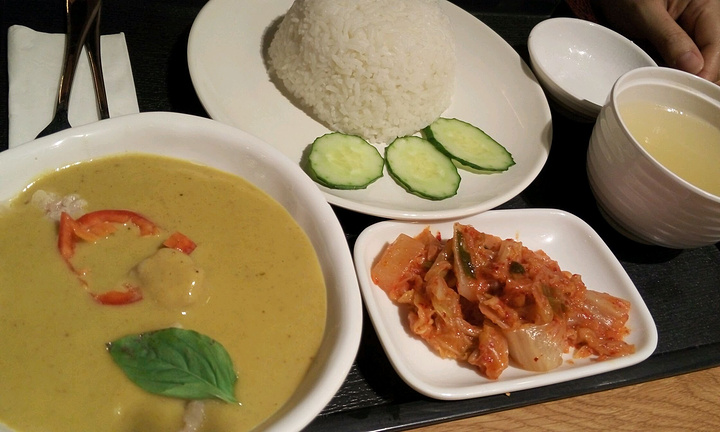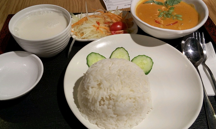 岭南站是祖庙商圈今年新开的一个商场,人气挺旺的。这家小泰太就在岭南站lg1层,不难找,到处都有清晰的指引。装修风格比较简单,主打泰式简餐。25元一份的套餐,选择一款咖喱,有红咖喱,青咖喱,黄咖喱,肉可以选择鸡,牛,猪,再选择一份素菜和一个汤,3样东西简简单单,很适合附近的上班一族,尤其是白领们,附近写字楼较多,用餐时间还是需求比较旺的。上菜也是比较快的,因为都是已经准备好的。椰汁汤,有很浓的椰汁味道,有点酸,不知道放了什么腌制过的东西,估计不是很多人能接受这个味道。木瓜沙拉,一般吧。青咖喱鸡,咖喱味道偏填。黄咖喱鸡,对比青咖喱这个黄咖喱是辣一点的。泡菜,太咸了,不好吃。总结一句,来过一次尝过鲜,下次应该不会再进来了。