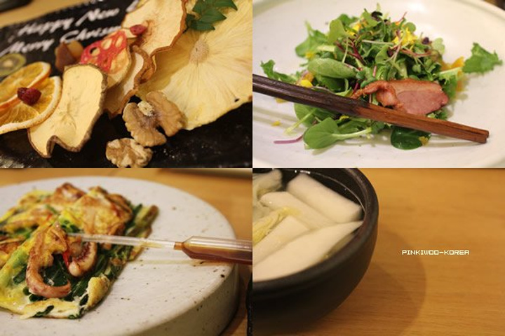 第一道开胃菜就是吐槽的蔬菜水果干。 说实话,酸酸的挺好吃的,就是费牙,太费牙!! 餐厅是按照人数份量的方式上餐,有几个人上几人份,有一种韩餐定食和西餐相结合的感觉。 就是每份极少,比法餐还少,我当时饿啊,只能喝泡菜汤= =