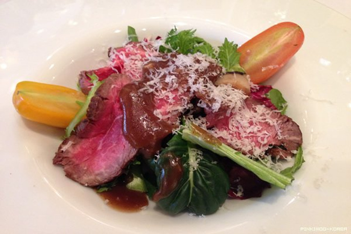 菜色一般,对牛肉沙拉和最后山楂味的冰淇淋甜品印象深刻。 牛肉是美国厨艺大师里边戈登拉姆齐经常说的那种漂亮的粉红色。 话说平时在国内,牛肉不敢吃这么生。
