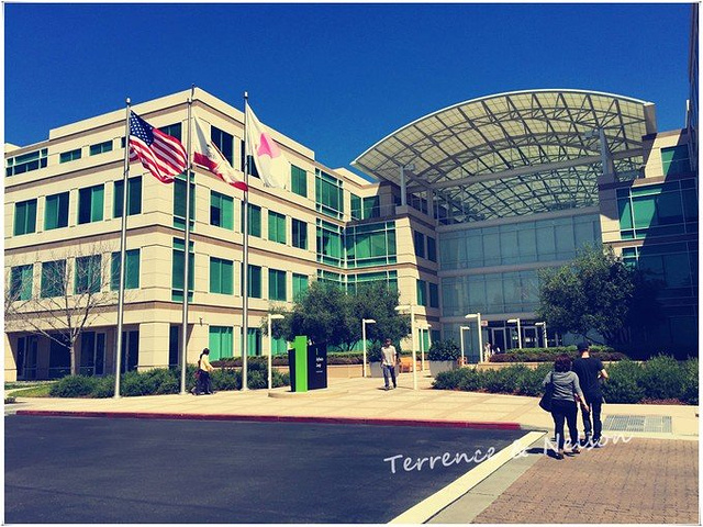 从斯坦福出来驾车开一段在树林中的优美公路,很快就到了苹果总部... 原本想像中的苹果总部应该是超科技感、玻璃外观、高耸的建筑,到了后看到它!也就是我们国家乡镇企业的外形嘛~~