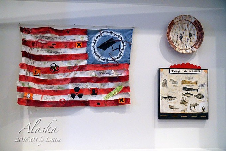 计划晚上边泡温泉边看极光,但是离日落还有很久,于是临时起意去阿拉斯加博物馆转转 阿拉斯加博物馆在阿拉斯加大学校区,在Fairbanks市区内,门票$12每人,展品主要是古生物模型,当地人的手工艺品,阿拉斯加元素的相关创作。另外还有一些循环播放的视频,比如化石考古记录,古生物模型制作等等。最有意义的是,我们在这里听到了极光的声音