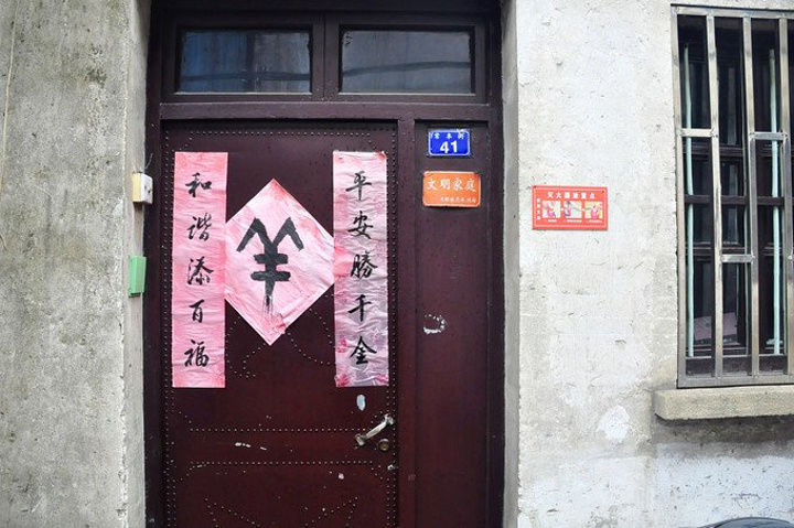 家家户户的门上都张贴着羊年春节对联和羊字符号图案,以表达当地居民祈求新年福运的心愿`