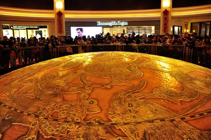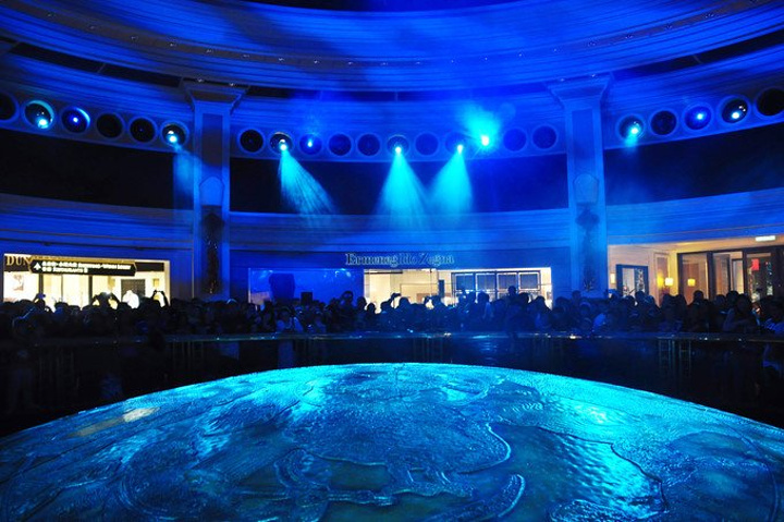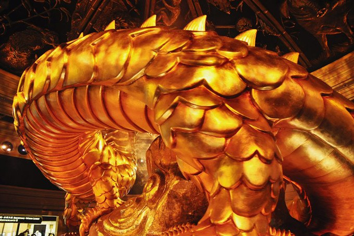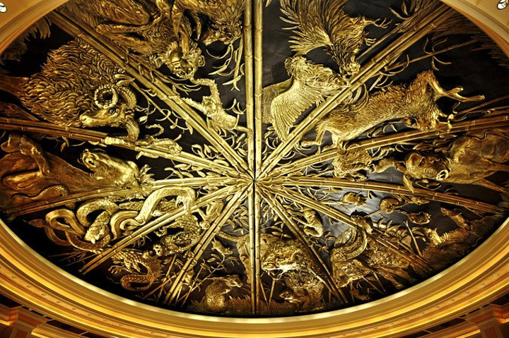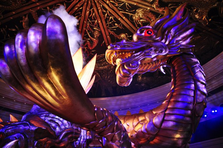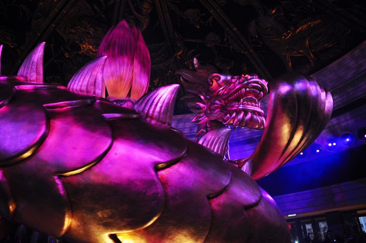 演出大堂一片金光熠熠,上为刻有十二生肖的穹顶,下为刻有十二星座的拱盖,由此诞生一树一龙,寓为开天辟地~