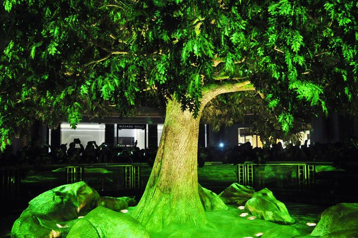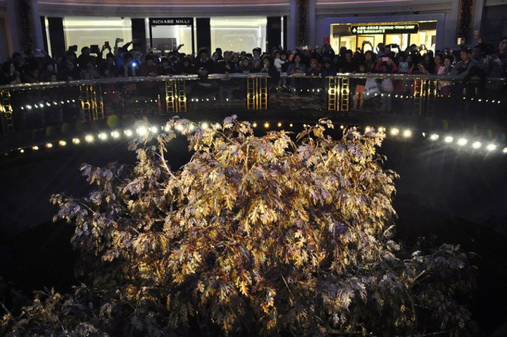 当吉祥树完全升起后开始旋转,并以绿、黄、红、银四色变换代表着四季不同姿态·